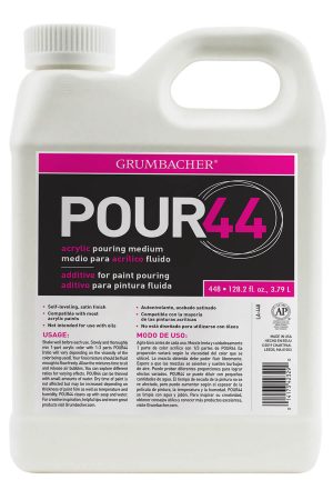 When POUR44 is mixed with acrylic paint, it will impart a self-leveling satin finish. Versatile medium for all kinds of popular pouring techniques and compatible with most acrylic paints. Other uses include to thin and transparentize acrylic color and mediums.