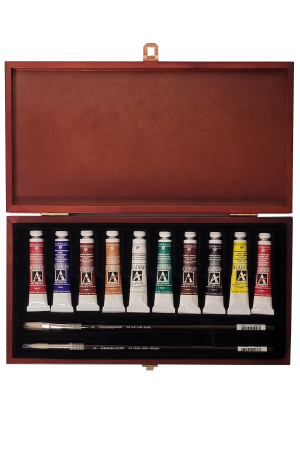 10 Academy Oil colors are housed in this beautiful cherry-stained wooden box with 1 round and 1 flat brush. This ten color set has a sample of primary, secondary, and earth tone colors plus tubes of black and white. It’s a perfect collection of paints for those looking to try their hand at blending, layering and creating works in oil paint! Each paint has been carefully selected to offer superior lightfastness to ensure your works won’t fade.