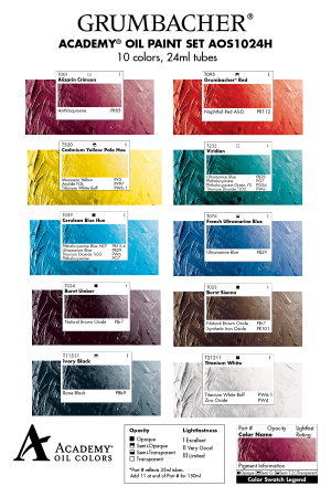 Academy oil paints are thick and creamy colors that hold texture with a palette knife just as well as fine detail with a brush.  Grumbacher uses premium pigments in all of its paints to ensure fade resistance and clean mixability with superior tinting strength. Cadmium Hues are alternative duplicates of the pure, cadmium color but are non-toxic. Colors remain brilliant even when diluted with solvents or painting media.