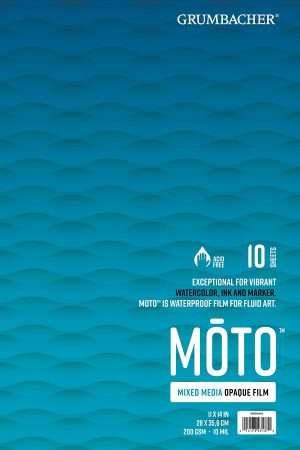 Grumbacher® MŌTO™ is a mixed media, opaque, bright white film. It’s made from polypropylene, resulting in a waterproof, smooth surface. This 200GSM media easily resists tearing or buckling. It’s exceptional for fluid art techniques, such as watercolor, ink and marker.