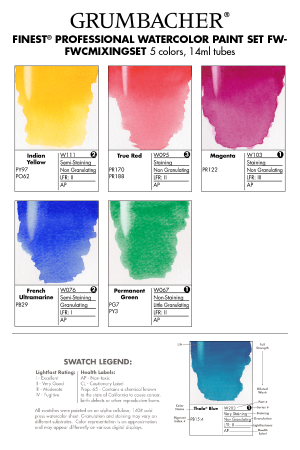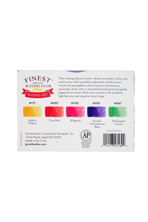 Five essential watercolors for mixing come in a compact set with large 14ml tubes. These carefully selected paints create vibrant secondary colors and earth tones with beautiful undertones. Easily create mood and atmosphere; colors layer beautifully for luminescent paintings. Finest Watercolors are professional-grade paints formulated with premium-grade pigments to ensure fluid, even washes with excellent lightfastness and superior tonal range.