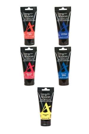 This 5 piece set has 75ml tubes of designer paints and can mix an infinite number of secondary and tertiary colors. Process colors are a well-known designer staples for their bright mixes, while blue and red paints round out the selection to reach a full range of color possibilities. This set is ideal for starting your acrylic paint color palette!