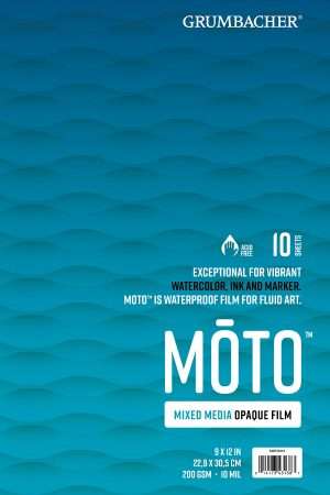 Grumbacher® MŌTO™ is a mixed media, opaque, bright white film. It’s made from polypropylene, resulting in a waterproof, smooth surface. This 200GSM media easily resists tearing or buckling. It’s exceptional for fluid art techniques, such as watercolor, ink and marker.